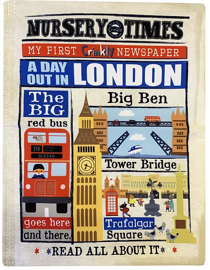 Nursery Times Crinkly Newspaper. A Day Out in London. 6 pages of beautiful illustrations and simple rhyming text. Dimensions approx: 30cm x 20cm. CE tested and machine washable. A practical, lightweight cloth book with crinkly pages. A great sensory toy. Each newspaper is packed in a gifting envelope to add 'To' and 'From' and a short message.